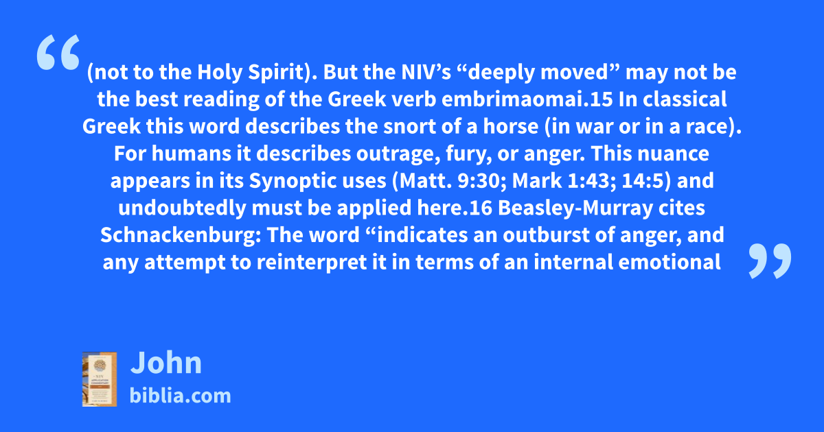 (not to the Holy Spirit). But the NIV’s “deeply moved” may not be the best reading of the Greek verb embrimaomai.15 In classical Greek this word describes the snort of a horse (in war or in a race). For humans it describes outrage, fury, or anger. This nuance appears in its Synoptic uses (Matt. 9:30; Mark 1:43; 14:5) and undoubtedly must be applied here.16 Beasley-Murray cites Schnackenburg: The word “indicates an outburst of anger, and any attempt to reinterpret it in terms of an internal emotional