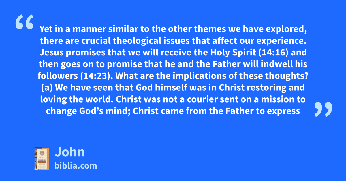 Yet in a manner similar to the other themes we have explored, there are crucial theological issues that affect our experience. Jesus promises that we will receive the Holy Spirit (14:16) and then goes on to promise that he and the Father will indwell his followers (14:23). What are the implications of these thoughts? (a) We have seen that God himself was in Christ restoring and loving the world. Christ was not a courier sent on a mission to change God’s mind; Christ came from the Father to express