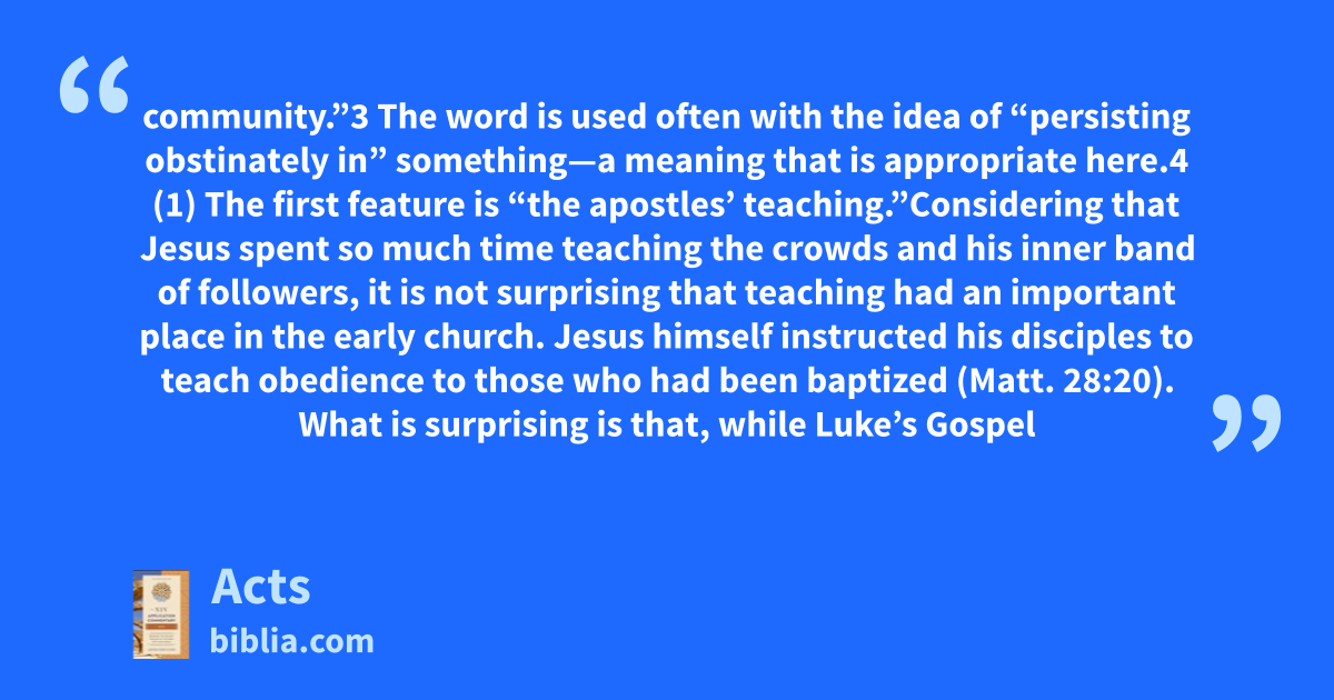 community.”3 The word is used often with the idea of “persisting obstinately in” something—a meaning that is appropriate here.4 (1) The first feature is “the apostles’ teaching.”Considering that Jesus spent so much time teaching the crowds and his inner band of followers, it is not surprising that teaching had an important place in the early church. Jesus himself instructed his disciples to teach obedience to those who had been baptized (Matt. 28:20). What is surprising is that, while Luke’s Gospel