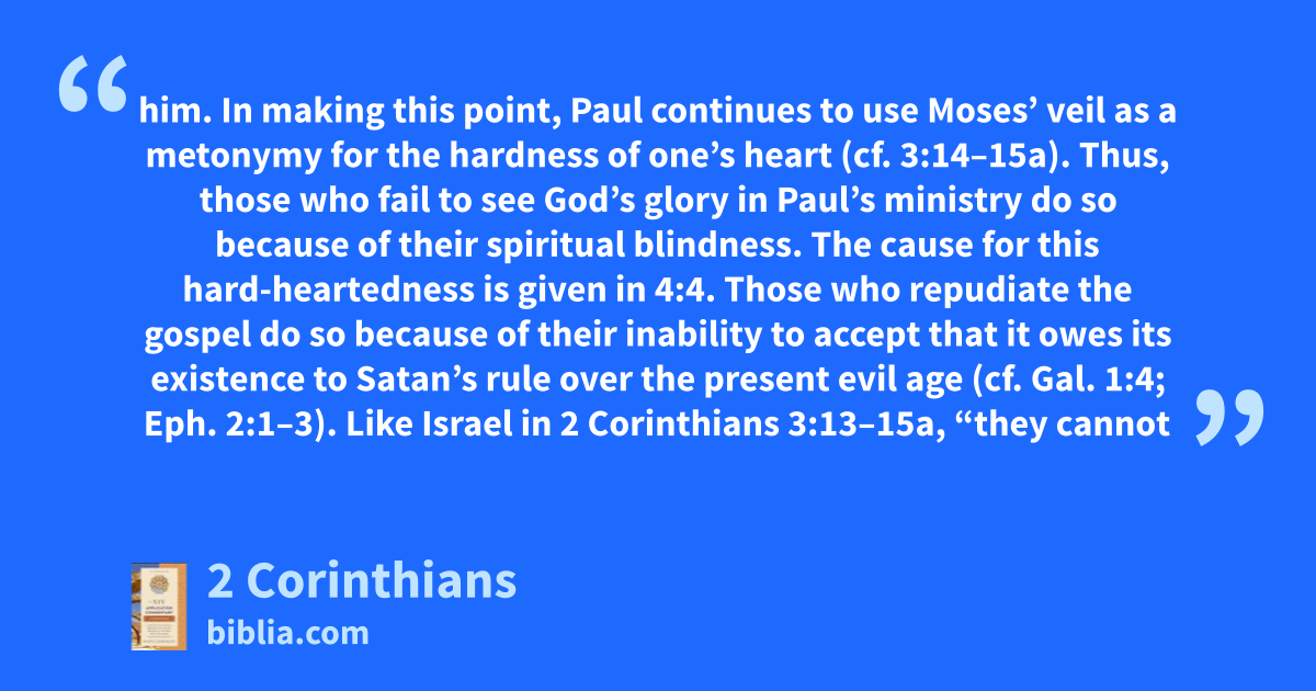 him. In making this point, Paul continues to use Moses’ veil as a metonymy for the hardness of one’s heart (cf. 3:14–15a). Thus, those who fail to see God’s glory in Paul’s ministry do so because of their spiritual blindness. The cause for this hard-heartedness is given in 4:4. Those who repudiate the gospel do so because of their inability to accept that it owes its existence to Satan’s rule over the present evil age (cf. Gal. 1:4; Eph. 2:1–3). Like Israel in 2 Corinthians 3:13–15a, “they cannot