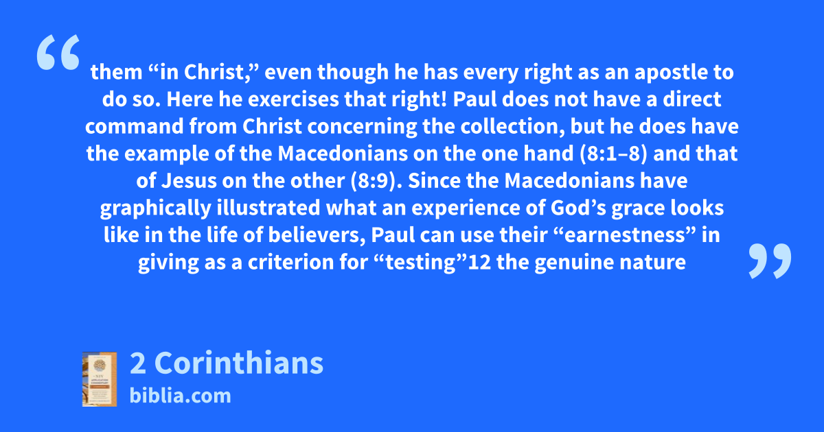 them “in Christ,” even though he has every right as an apostle to do so. Here he exercises that right! Paul does not have a direct command from Christ concerning the collection, but he does have the example of the Macedonians on the one hand (8:1–8) and that of Jesus on the other (8:9). Since the Macedonians have graphically illustrated what an experience of God’s grace looks like in the life of believers, Paul can use their “earnestness” in giving as a criterion for “testing”12 the genuine nature