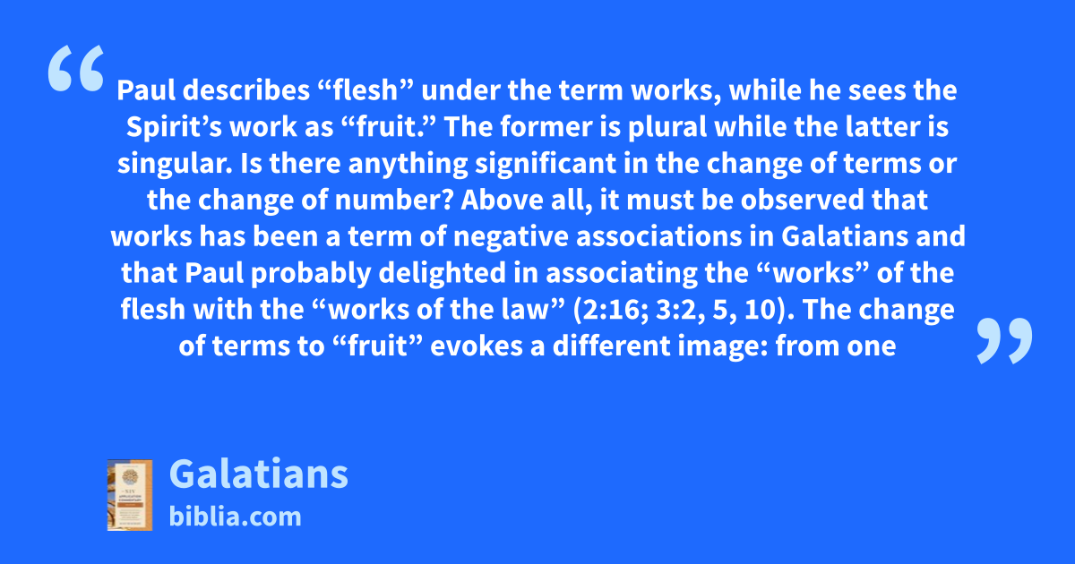 Paul describes “flesh” under the term works, while he sees the Spirit’s work as “fruit.” The former is plural while the latter is singular. Is there anything significant in the change of terms or the change of number? Above all, it must be observed that works has been a term of negative associations in Galatians and that Paul probably delighted in associating the “works” of the flesh with the “works of the law” (2:16; 3:2, 5, 10). The change of terms to “fruit” evokes a different image: from one