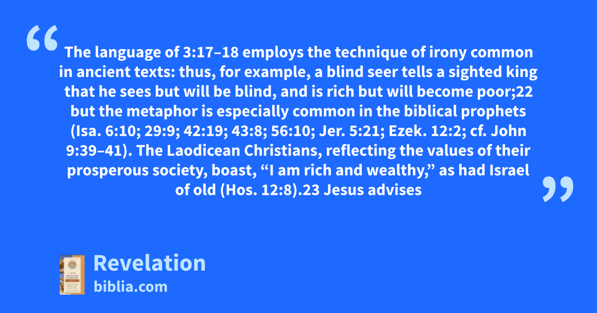 The language of 3:17–18 employs the technique of irony common in ancient texts: thus, for example, a blind seer tells a sighted king that he sees but will be blind, and is rich but will become poor;22 but the metaphor is especially common in the biblical prophets (Isa. 6:10; 29:9; 42:19; 43:8; 56:10; Jer. 5:21; Ezek. 12:2; cf. John 9:39–41). The Laodicean Christians, reflecting the values of their prosperous society, boast, “I am rich and wealthy,” as had Israel of old (Hos. 12:8).23 Jesus advises