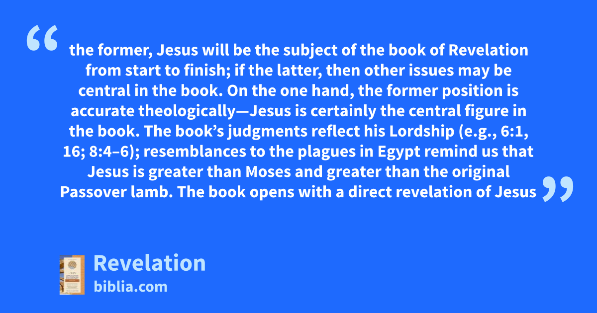 the former, Jesus will be the subject of the book of Revelation from start to finish; if the latter, then other issues may be central in the book. On the one hand, the former position is accurate theologically—Jesus is certainly the central figure in the book. The book’s judgments reflect his Lordship (e.g., 6:1, 16; 8:4–6); resemblances to the plagues in Egypt remind us that Jesus is greater than Moses and greater than the original Passover lamb. The book opens with a direct revelation of Jesus