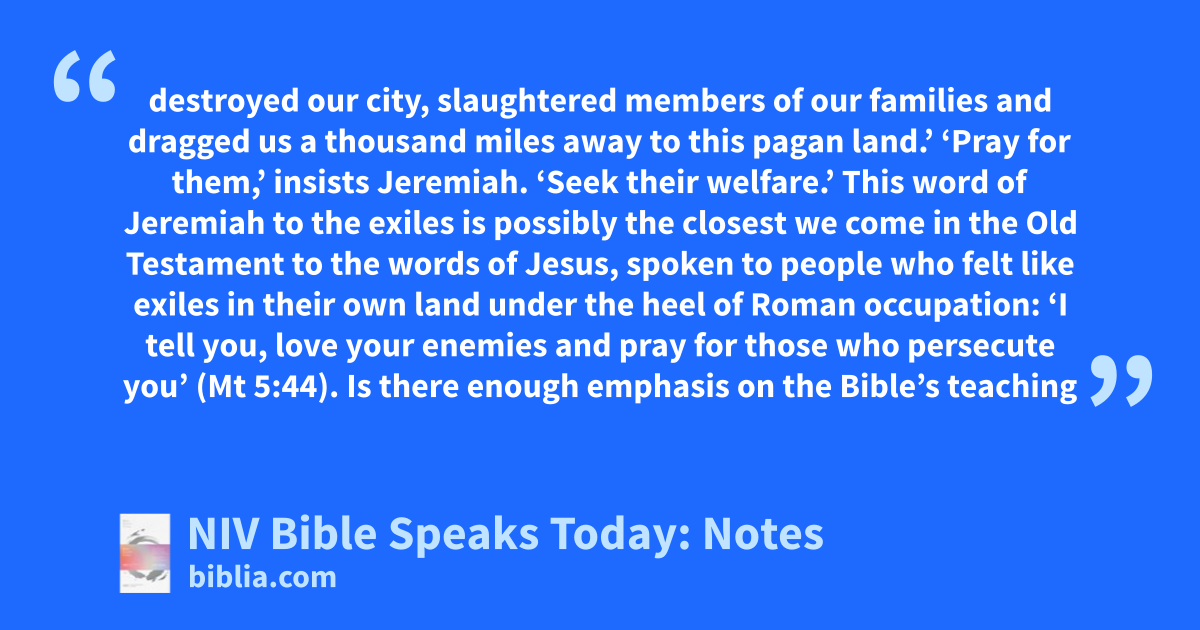 destroyed our city, slaughtered members of our families and dragged us a thousand miles away to this pagan land.’ ‘Pray for them,’ insists Jeremiah. ‘Seek their welfare.’ This word of Jeremiah to the exiles is possibly the closest we come in the Old Testament to the words of Jesus, spoken to people who felt like exiles in their own land under the heel of Roman occupation: ‘I tell you, love your enemies and pray for those who persecute you’ (Mt 5:44). Is there enough emphasis on the Bible’s teaching