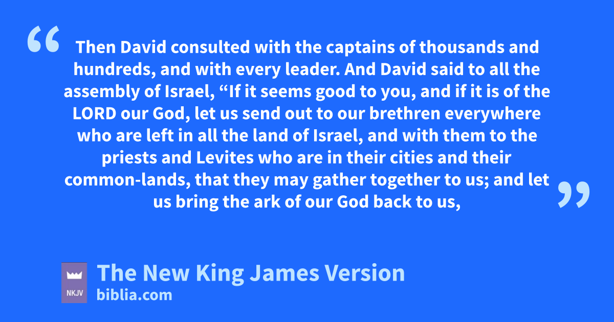 13 Then David consulted with the acaptains of thousands and hundreds, and with every leader. 2 And David said to all the assembly of Israel, “If it seems good to you, and if it is of the Lord our God, let us send out to our brethren everywhere who are bleft in all the land of Israel, and with them to the priests and Levites who are in their cities and their common-lands, that they may gather together to us; 3 and let us bring the ark of our God back to us, cfor we have not inquired at it since the days of Saul.” 4 Then all the assembly said that they would do so, for the thing was right in the eyes of all the people.