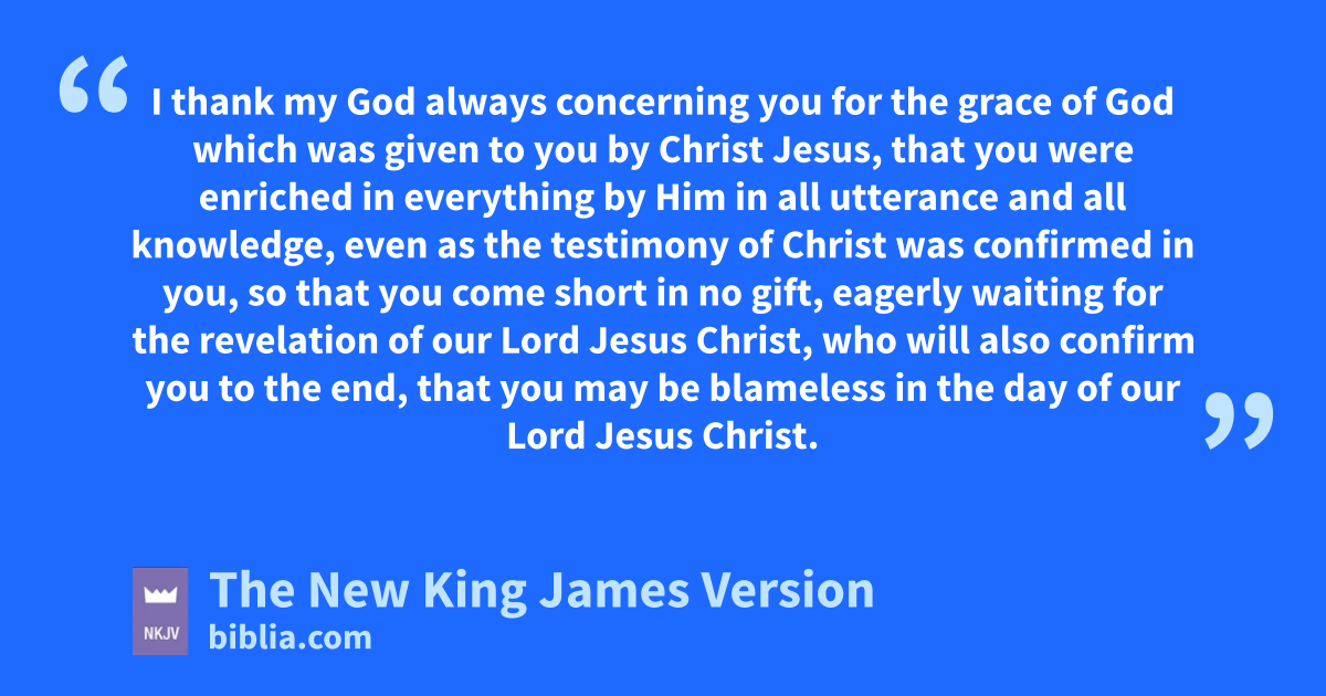 4 iI thank my God always concerning you for the grace of God which was given to you by Christ Jesus, 5 that you were enriched in everything by Him jin all 2utterance and all knowledge, 6 even as kthe testimony of Christ was confirmed 3in you, 7 so that you come short in no gift, eagerly lwaiting for the revelation of our Lord Jesus Christ, 8 mwho will also confirm you to the end, nthat you may be blameless in the day of our Lord Jesus Christ. 9 oGod is faithful, by whom you were called into pthe fellowship of His Son, Jesus Christ our Lord.