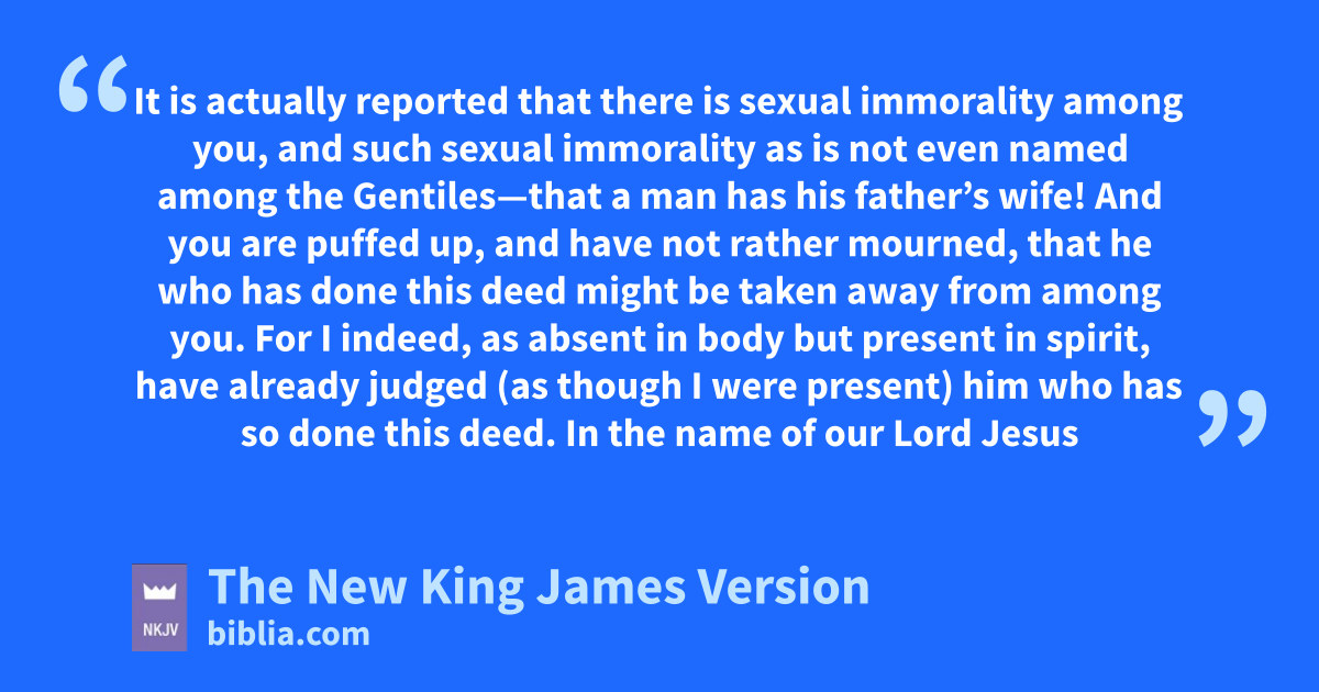 5 It is actually reported that there is sexual immorality among you, and such sexual immorality as is not even 1named among the Gentiles—that a man has his father’s awife! 2 bAnd you are 2puffed up, and have not rather cmourned, that he who has done this deed might be taken away from among you. 3 dFor I indeed, as absent in body but present in spirit, have already judged (as though I were present) him who has so done this deed. 4 In the ename of our Lord Jesus Christ, when you are gathered together, along with my spirit, fwith the power of our Lord Jesus Christ, 5 gdeliver such a one to hSatan for the destruction of the flesh, that his spirit may be saved in the day of the Lord 3Jesus.
