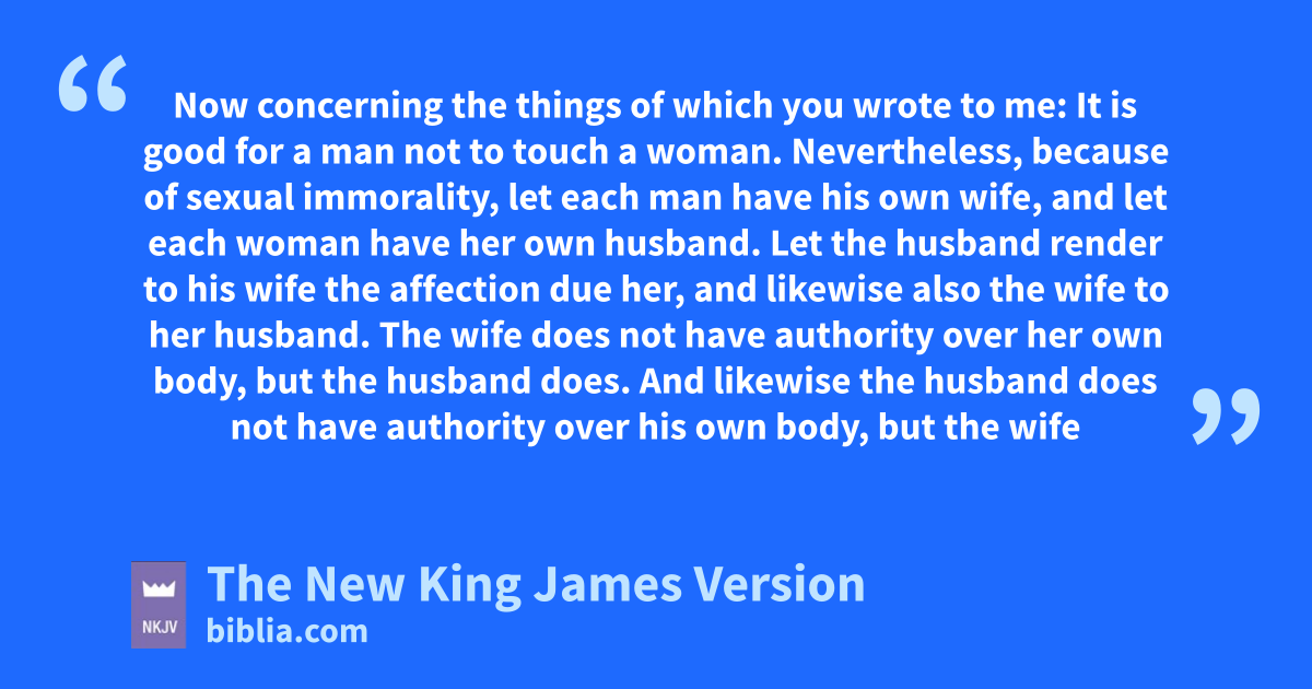 aIt is good for a man not to touch a woman. 2 Nevertheless, because of sexual immorality, let each man have his own wife, and let each woman have her own husband. 3 bLet the husband render to his wife the affection due her, and likewise also the wife to her husband. 4 The wife does not have authority over her own body, but the husband does. And likewise the husband does not have authority over his own body, but the wife does. 5 cDo not deprive one another except with consent for a time, that you may give yourselves to fasting and prayer; and come together again so that dSatan does not tempt you because of your lack of self-control. 6 But I say this as a concession, enot as a commandment. 7 For fI wish that all men were even as I myself. But each one has his own gift from God, one in this manner and another in that.