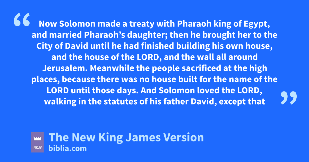 3 Now aSolomon made 1a treaty with Pharaoh king of Egypt, and married Pharaoh’s daughter; then he brought her bto the City of David until he had finished building his cown house, and dthe house of the Lord, and ethe wall all around Jerusalem. 2 fMeanwhile the people sacrificed at the high places, because there was no house built for the name of the Lord until those days. 3 And Solomon gloved the Lord, hwalking in the statutes of his father David, except that he sacrificed and burned incense at the high places.