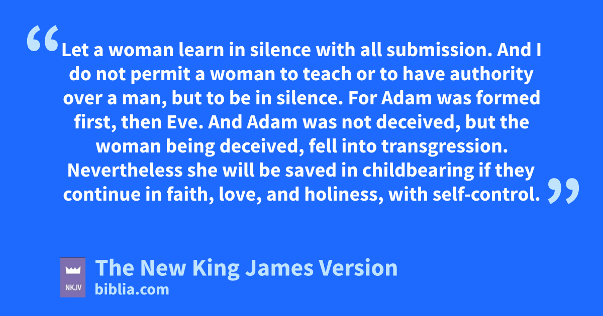 8 I desire therefore that the men pray leverywhere, mlifting up holy hands, without wrath and doubting; 9 in like manner also, that the nwomen adorn themselves in modest apparel, with propriety and 5moderation, not with braided hair or gold or pearls or costly clothing, 10 obut, which is proper for women professing godliness, with good works. 11 Let a woman learn in silence with all submission. 12 And pI do not permit a woman to teach or to have authority over a man, but to be in silence. 13 For Adam was formed first, then Eve. 14 And Adam was not deceived, but the woman being deceived, fell into transgression. 15 Nevertheless she will be saved in childbearing if they continue in faith, love, and holiness, with self-control.