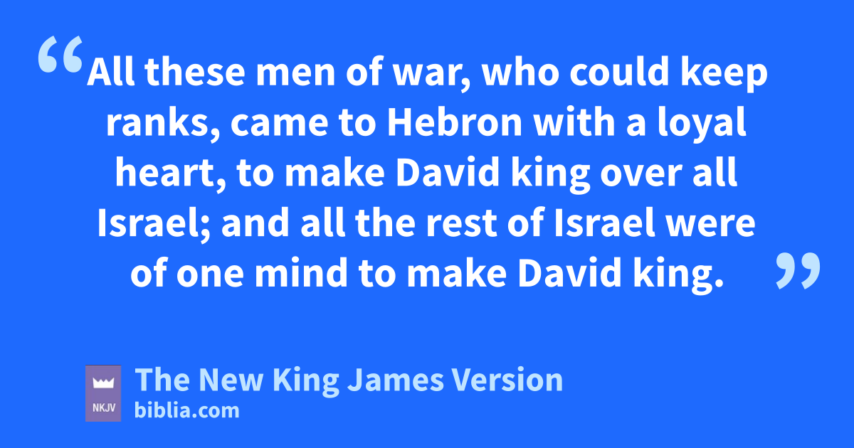 38 All these men of war, who could keep ranks, came to Hebron with a loyal heart, to make David king over all Israel; and all the rest of Israel were of tone mind to make David king. 39 And they were there with David three days, eating and drinking, for their brethren had prepared for them. 40 Moreover those who were near to them, from as far away as Issachar and Zebulun and Naphtali, were bringing food on donkeys and camels, on mules and oxen—provisions of flour and cakes of figs and cakes of raisins, wine and oil and oxen and sheep abundantly, for there was joy in Israel.
