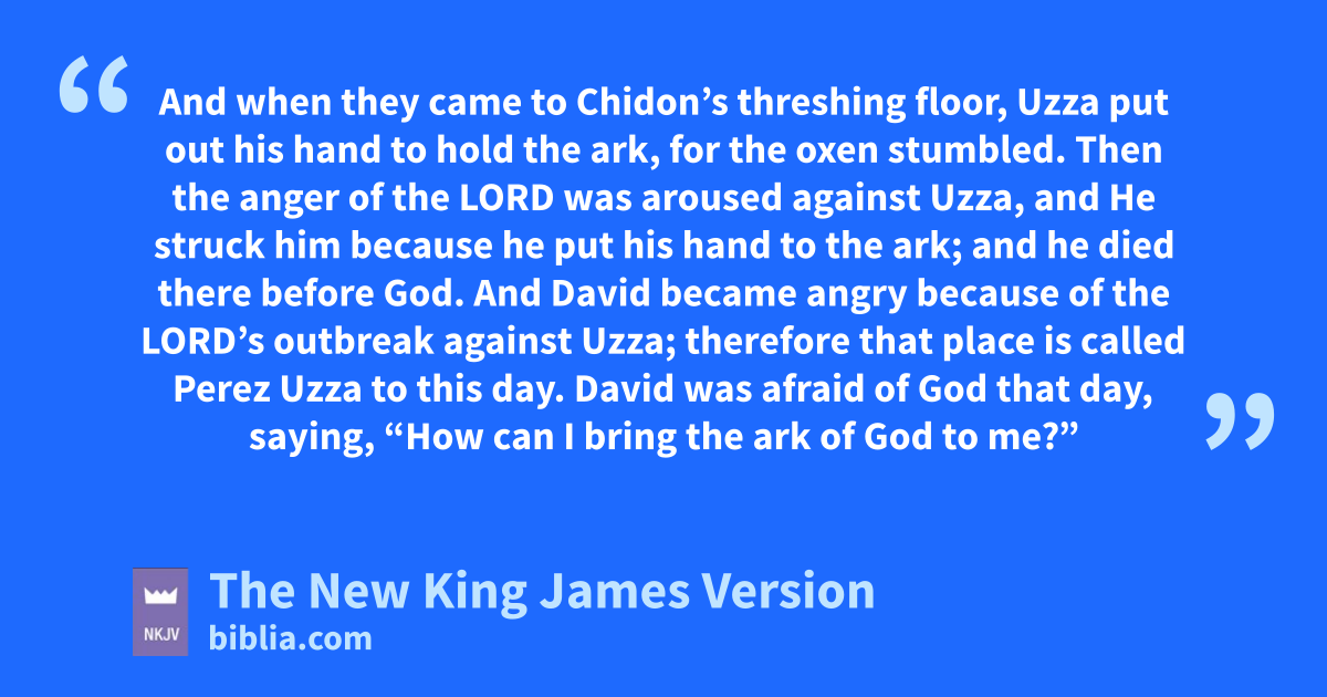 9 And when they came to 4Chidon’s threshing floor, Uzza put out his hand to hold the ark, for the oxen 5stumbled. 10 Then the anger of the Lord was aroused against Uzza, and He struck him lbecause he put his hand to the ark; and he mdied there before God. 11 And David became angry because of the Lord’s outbreak against Uzza; therefore that place is called 6Perez Uzza to this day. 12 David was afraid of God that day, saying, “How can I bring the ark of God to me?”