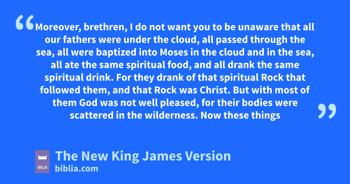 10 Moreover, brethren, I do not want you to be unaware that all our fathers were under athe cloud, all passed through bthe sea, 2 all were baptized into Moses in the cloud and in the sea, 3 all ate the same cspiritual food, 4 and all drank the same dspiritual drink. For they drank of that spiritual Rock that followed them, and that Rock was Christ. 5 But with most of them God was not well pleased, for their bodies ewere scattered in the wilderness.