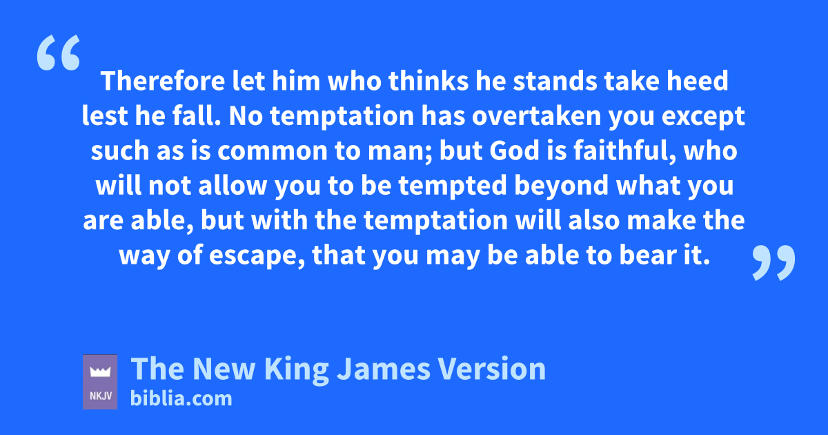 12 Therefore slet him who thinks he stands take heed lest he fall. 13 No temptation has overtaken you except such as is common to man; but tGod is faithful, uwho will not allow you to be tempted beyond what you are able, but with the temptation will also make the way of escape, that you may be able to 4bear it.