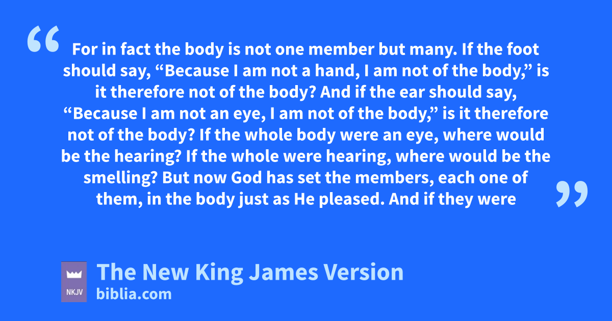 15 If the foot should say, “Because I am not a hand, I am not of the body,” is it therefore not of the body? 16 And if the ear should say, “Because I am not an eye, I am not of the body,” is it therefore not of the body? 17 If the whole body were an eye, where would be the hearing? If the whole were hearing, where would be the smelling? 18 But now xGod has set the members, each one of them, in the body yjust as He pleased. 19 And if they were all one member, where would the body be?