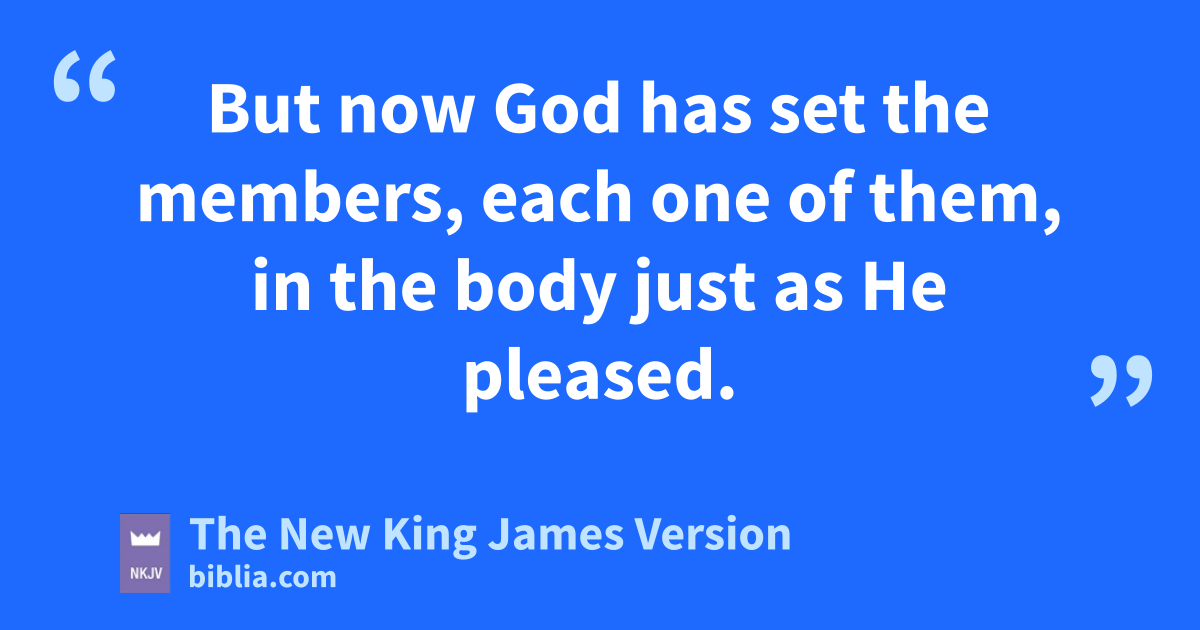 20 But now indeed there are many members, yet one body. 21 And the eye cannot say to the hand, “I have no need of you”; nor again the head to the feet, “I have no need of you.” 22 No, much rather, those members of the body which seem to be weaker are necessary. 23 And those members of the body which we think to be less honorable, on these we bestow greater honor; and our unpresentable parts have greater modesty, 24 but our presentable parts have no need. But God composed the body, having given greater honor to that part which lacks it, 25 that there should be no 8schism in the body, but that the members should have the same care for one another. 26 And if one member suffers, all the members suffer with it; or if one member is honored, all the members rejoice with it.