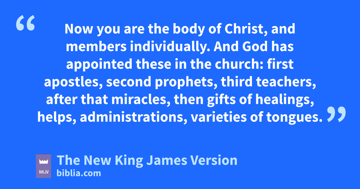 27 Now zyou are the body of Christ, and amembers individually. 28 And bGod has appointed these in the church: first capostles, second dprophets, third teachers, after that emiracles, then fgifts of healings, ghelps, hadministrations, varieties of tongues. 29 Are all apostles? Are all prophets? Are all teachers? Are all workers of miracles? 30 Do all have gifts of healings? Do all speak with tongues? Do all interpret? 31 But iearnestly desire the 9best gifts. And yet I show you a more excellent way.