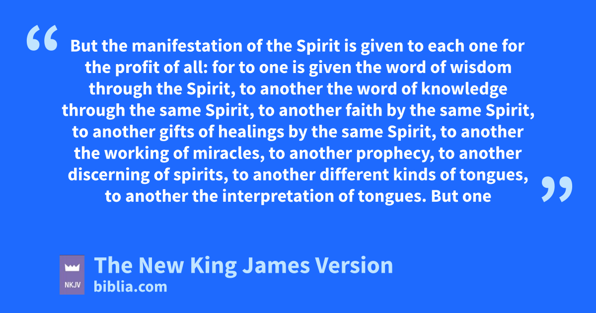 4 eThere are 4diversities of gifts, but fthe same Spirit. 5 gThere are differences of ministries, but the same Lord. 6 And there are diversities of activities, but it is the same God hwho works 5all in all. 7 But the manifestation of the Spirit is given to each one for the profit of all: 8 for to one is given ithe word of wisdom through the Spirit, to another jthe word of knowledge through the same Spirit, 9 kto another faith by the same Spirit, to another lgifts of healings by 6the same Spirit, 10 mto another the working of miracles, to another nprophecy, to another odiscerning of spirits, to another pdifferent kinds of tongues, to another the interpretation of tongues. 11 But one and the same Spirit works all these things, qdistributing to each one individually ras He wills.
