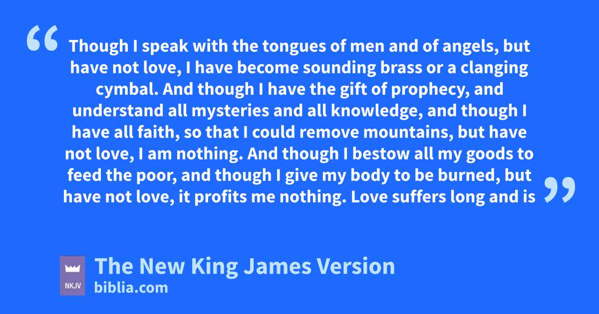 13 Though I speak with the tongues of men and of angels, but have not love, I have become sounding brass or a clanging cymbal. 2 And though I have the gift of aprophecy, and understand all mysteries and all knowledge, and though I have all faith, bso that I could remove mountains, but have not love, I am nothing. 3 And cthough I bestow all my goods to feed the poor, and though I give my body 1to be burned, but have not love, it profits me nothing.