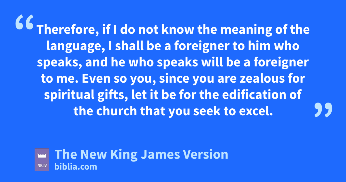 6 But now, brethren, if I come to you speaking with tongues, what shall I profit you unless I speak to you either by frevelation, by knowledge, by prophesying, or by teaching? 7 Even things without life, whether flute or harp, when they make a sound, unless they make a distinction in the sounds, how will it be known what is piped or played? 8 For if the trumpet makes an uncertain sound, who will prepare for battle? 9 So likewise you, unless you utter by the tongue words easy to understand, how will it be known what is spoken? For you will be speaking into the air. 10 There are, it may be, so many kinds of languages in the world, and none of them is without 2significance. 11 Therefore, if I do not know the meaning of the language, I shall be a 3foreigner to him who speaks, and he who speaks will be a foreigner to me. 12 Even so you, since you are 4zealous for spiritual gifts, let it be for the 5edification of the church that you seek to excel.