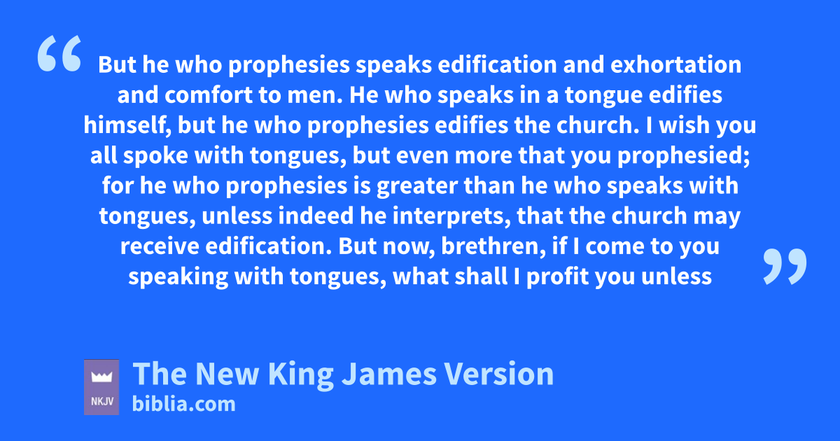 14 Pursue love, and adesire spiritual gifts, bbut especially that you may prophesy. 2 For he who cspeaks in a tongue does not speak to men but to God, for no one understands him; however, in the spirit he speaks mysteries. 3 But he who prophesies speaks dedification and eexhortation and comfort to men. 4 He who speaks in a tongue edifies himself, but he who prophesies edifies the church. 5 I wish you all spoke with tongues, but even more that you prophesied; 1for he who prophesies is greater than he who speaks with tongues, unless indeed he interprets, that the church may receive edification.