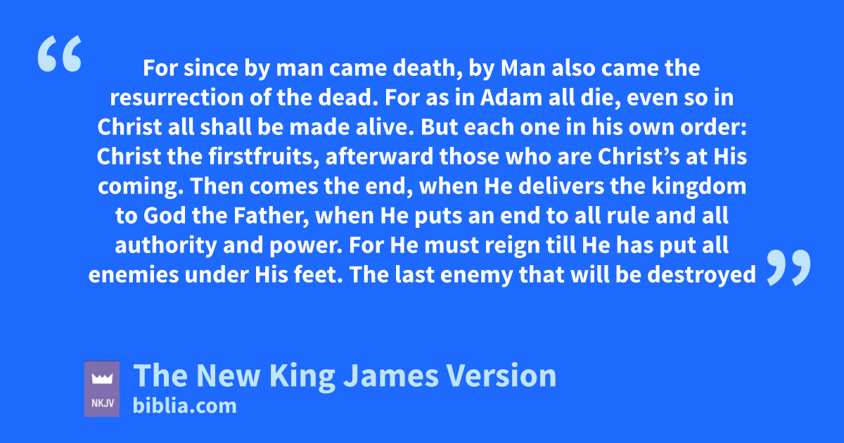 20 But now vChrist is risen from the dead, and has become wthe firstfruits of those who have 4fallen asleep. 21 For xsince by man came death, yby Man also came the resurrection of the dead. 22 For as in Adam all die, even so in Christ all shall zbe made alive. 23 But aeach one in his own order: Christ the firstfruits, afterward those who are Christ’s at His coming. 24 Then comes the end, when He delivers bthe kingdom to God the Father, when He puts an end to all rule and all authority and power. 25 For He must reign ctill He has put all enemies under His feet. 26 dThe last enemy that will be destroyed is death. 27 For e“He has put all things under His feet.” But when He says “all things are put under Him,” it is evident that He who put all things under Him is excepted. 28 fNow when all things are made subject to Him, then gthe Son Himself will also be subject to Him who put all things under Him, that God may be all in all.