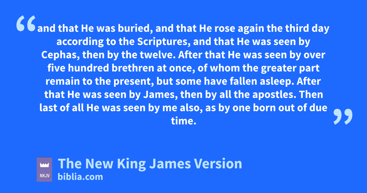 3 For eI delivered to you first of all that fwhich I also received: that Christ died for our sins gaccording to the Scriptures, 4 and that He was buried, and that He rose again the third day haccording to the Scriptures, 5 iand that He was seen by 1Cephas, then jby the twelve. 6 After that He was seen by over five hundred brethren at once, of whom the greater part remain to the present, but some have 2fallen asleep. 7 After that He was seen by James, then kby all the apostles. 8 lThen last of all He was seen by me also, as by one born out of due time.
