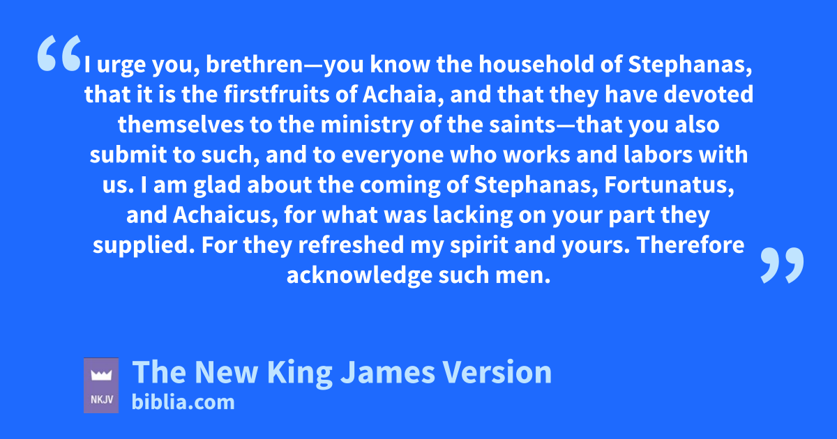 15 I urge you, brethren—you know tthe household of Stephanas, that it is uthe firstfruits of Achaia, and that they have devoted themselves to vthe ministry of the saints—16 wthat you also submit to such, and to everyone who works and xlabors with us.