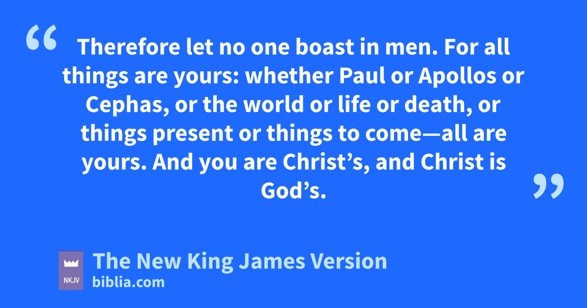 18 sLet no one deceive himself. If anyone among you seems to be wise in this age, let him become a fool that he may become wise. 19 For the wisdom of this world is foolishness with God. For it is written, t“He catches the wise in their own craftiness”; 20 and again, u“The Lord knows the thoughts of the wise, that they are futile.” 21 Therefore let no one boast in men. For vall things are yours: 22 whether Paul or Apollos or Cephas, or the world or life or death, or things present or things to come—all are yours. 23 And wyou are Christ’s, and Christ is God’s.