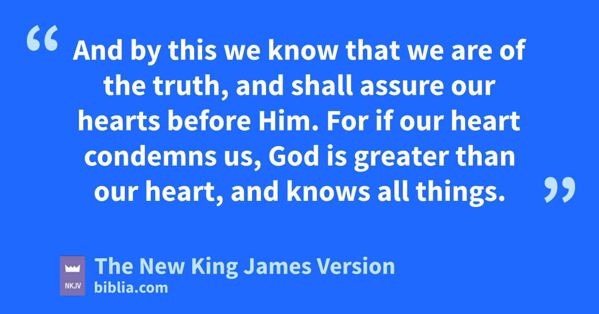 18 My little children, ylet us not love in word or in tongue, but in deed and in truth. 19 And by this we 4know zthat we are of the truth, and shall 5assure our hearts before Him. 20 aFor if our heart condemns us, God is greater than our heart, and knows all things. 21 Beloved, if our heart does not condemn us, bwe have confidence toward God. 22 And cwhatever we ask we receive from Him, because we keep His commandments dand do those things that are pleasing in His sight. 23 And this is His commandment: that we should believe on the name of His Son Jesus Christ eand love one another, as He gave 6us commandment.