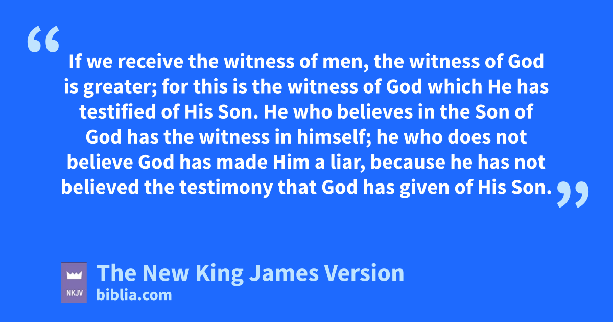 9 If we receive nthe witness of men, the witness of God is greater; ofor this is the witness of 3God which He has testified of His Son. 10 He who believes in the Son of God phas the witness in himself; he who does not believe God qhas made Him a liar, because he has not believed the testimony that God has given of His Son. 11 And this is the testimony: that God has given us eternal life, and this life is in His Son. 12 rHe who has the Son has 4life; he who does not have the Son of God does not have 4life. 13 These things I have written to you who believe in the name of the Son of God, that you may know that you have eternal life, 5and that you may continue to believe in the name of the Son of God.