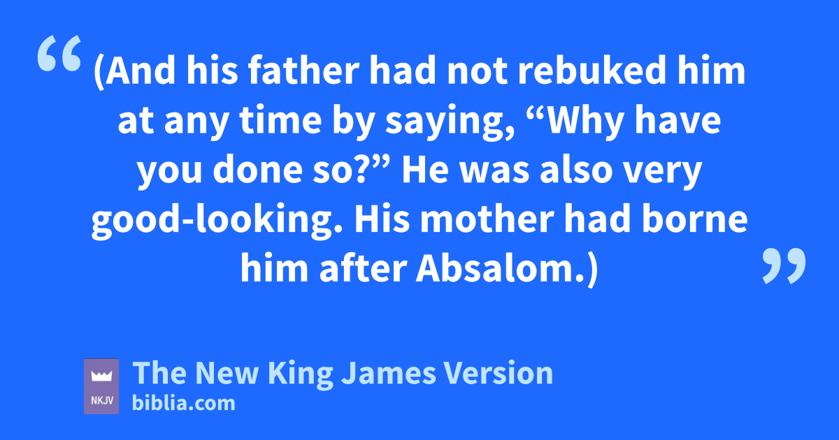 5 Then dAdonijah the 3son of Haggith exalted himself, saying, “I will 4be king”; and ehe prepared for himself chariots and horsemen, and fifty men to run before him. 6 (And his father had not 5rebuked him at any time by saying, “Why have you done so?” He was also very good-looking. fHis mother had borne him after Absalom.) 7 Then he conferred with gJoab the son of Zeruiah and with hAbiathar the priest, and ithey followed and helped Adonijah. 8 But jZadok the priest, kBenaiah the son of Jehoiada, lNathan the prophet, mShimei, Rei, and nthe mighty men who belonged to David were not with Adonijah.