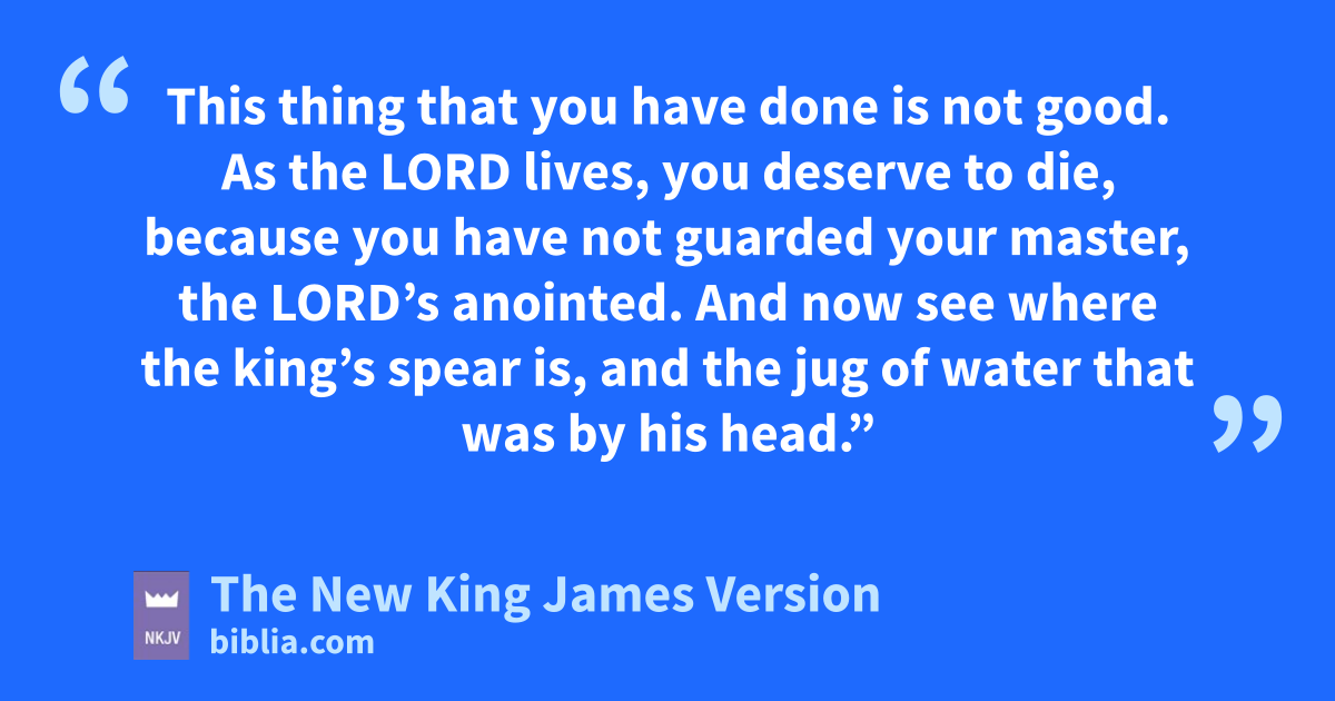 15 So David said to Abner, “Are you not a man? And who is like you in Israel? Why then have you not guarded your lord the king? For one of the people came in to destroy your lord the king. 16 This thing that you have done is not good. As the Lord lives, you deserve to die, because you have not guarded your master, the Lord’s anointed. And now see where the king’s spear is, and the jug of water that was by his head.”