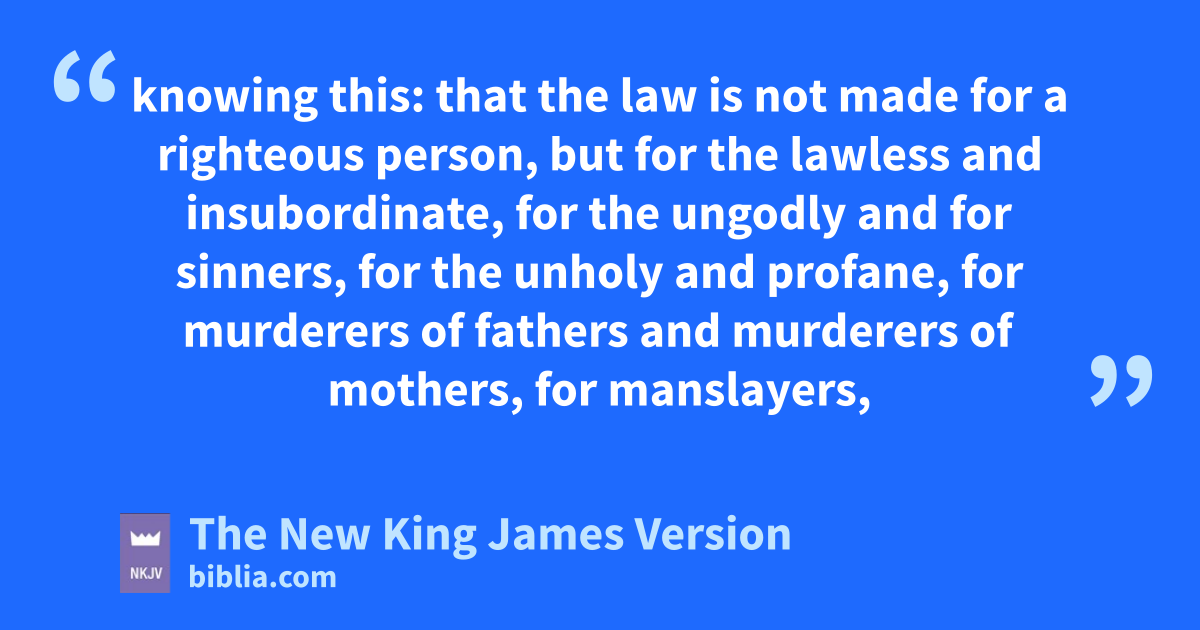 8 But we know that the law is igood if one uses it lawfully, 9 knowing this: that the law is not made for a righteous person, but for the lawless and insubordinate, for the ungodly and for sinners, for the unholy and profane, for murderers of fathers and murderers of mothers, for manslayers, 10 for fornicators, for sodomites, for kidnappers, for liars, for perjurers, and if there is any other thing that is 3contrary to sound doctrine, 11 according to the glorious gospel of the jblessed God which was kcommitted to my trust.