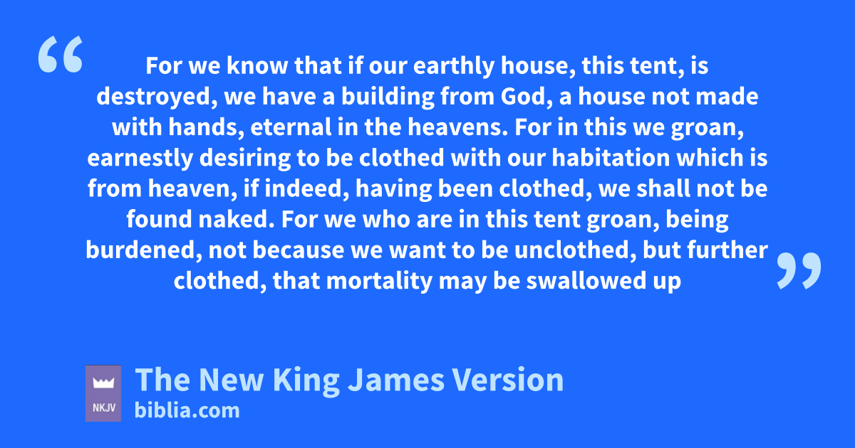 5 For we know that if aour earthly 1house, this tent, is destroyed, we have a building from God, a house bnot made with hands, eternal in the heavens. 2 For in this cwe groan, earnestly desiring to be clothed with our 2habitation which is from heaven, 3 if indeed, dhaving been clothed, we shall not be found naked. 4 For we who are in this tent groan, being burdened, not because we want to be unclothed, ebut further clothed, that mortality may be swallowed up by life. 5 Now He who has prepared us for this very thing is God, who also fhas given us the Spirit as 3a guarantee.