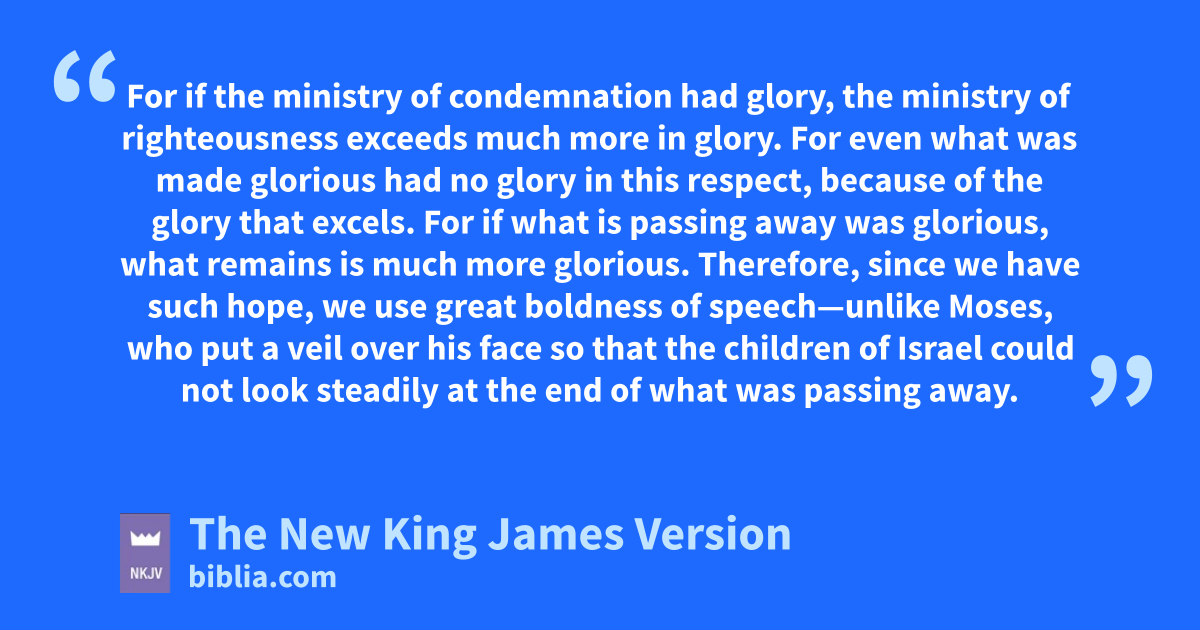 7 But if nthe ministry of death, owritten and engraved on stones, was glorious, pso that the children of Israel could not look steadily at the face of Moses because of the glory of his countenance, which glory was passing away, 8 how will qthe ministry of the Spirit not be more glorious? 9 For if the ministry of condemnation had glory, the ministry rof righteousness exceeds much more in glory. 10 For even what was made glorious had no glory in this respect, because of the glory that excels. 11 For if what is passing away was glorious, what remains is much more glorious.