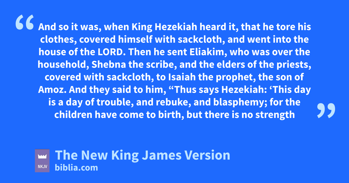 19 And aso it was, when King Hezekiah heard it, that he tore his clothes, covered himself with bsackcloth, and went into the house of the Lord. 2 Then he sent Eliakim, who was over the household, Shebna the scribe, and the elders of the priests, covered with sackcloth, to Isaiah the prophet, the son of Amoz. 3 And they said to him, “Thus says Hezekiah: ‘This day is a day of trouble, and rebuke, and blasphemy; for the children have come to birth, but there is no strength to 1bring them forth. 4 cIt may be that the Lord your God will hear all the words of the Rabshakeh, whom his master the king of Assyria has sent to dreproach the living God, and will erebuke the words which the Lord your God has heard. Therefore lift up your prayer for the remnant that is left.’ ”