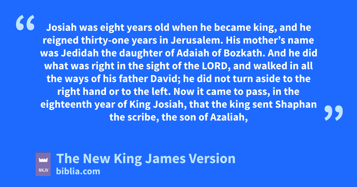22 Josiah awas eight years old when he became king, and he reigned thirty-one years in Jerusalem. His mother’s name was Jedidah the daughter of Adaiah of bBozkath. 2 And he did what was right in the sight of the Lord, and walked in all the ways of his father David; he cdid not turn aside to the right hand or to the left.