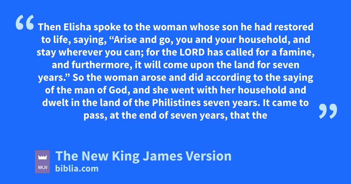 8 Then Elisha spoke to the woman awhose son he had restored to life, saying, “Arise and go, you and your household, and stay wherever you can; for the Lord bhas called for a cfamine, and furthermore, it will come upon the land for seven years.” 2 So the woman arose and did according to the saying of the man of God, and she went with her household and dwelt in the land of the Philistines seven years.