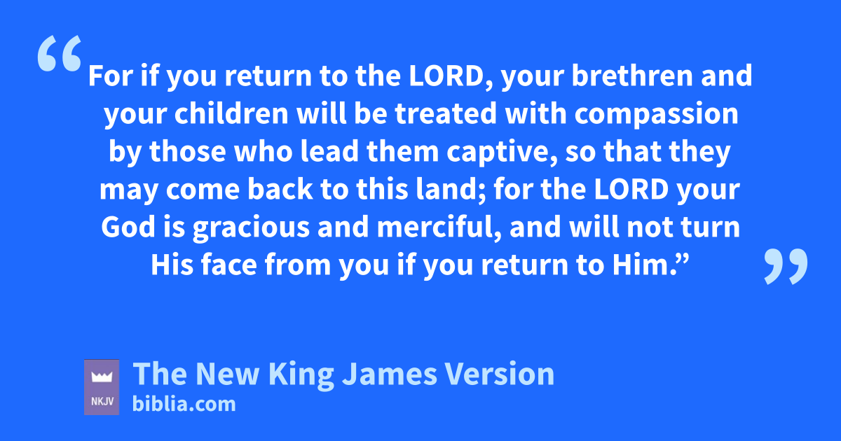 6 Then the drunners went throughout all Israel and Judah with the letters from the king and his leaders, and spoke according to the command of the king: “Children of Israel, ereturn to the Lord God of Abraham, Isaac, and Israel; then He will return to the remnant of you who have escaped from the hand of fthe kings of gAssyria. 7 And do not be hlike your fathers and your brethren, who trespassed against the Lord God of their fathers, so that He igave them up to jdesolation, as you see. 8 Now do not be kstiff-necked, 3as your fathers were, but yield yourselves to the Lord; and enter His sanctuary, which He has sanctified forever, and serve the Lord your God, lthat the fierceness of His wrath may turn away from you. 9 For if you return to the Lord, your brethren and your children will be treated with mcompassion by those who lead them captive, so that they may come back to this land; for the Lord your God is ngracious and merciful, and will not turn His face from you if you oreturn to Him.”