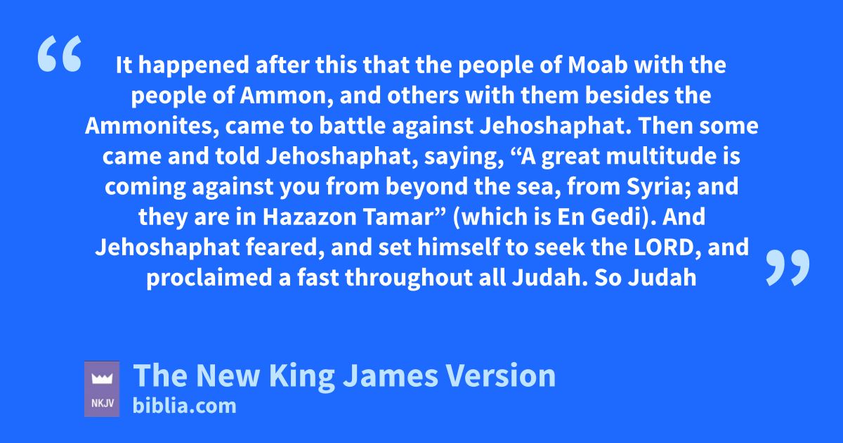 20 It happened after this that the people of aMoab with the people of bAmmon, and others with them besides the cAmmonites, 1came to battle against Jehoshaphat. 2 Then some came and told Jehoshaphat, saying, “A great multitude is coming against you from beyond the sea, from 2Syria; and they are din Hazazon Tamar” (which is eEn Gedi). 3 And Jehoshaphat feared, and set 3himself to fseek the Lord, and gproclaimed a fast throughout all Judah. 4 So Judah gathered together to ask hhelp from the Lord; and from all the cities of Judah they came to seek the Lord.