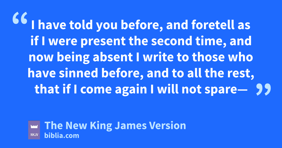 13 This will be athe third time I am coming to you. b“By the mouth of two or three witnesses every word shall be established.” 2 cI have told you before, and foretell as if I were present the second time, and now being absent 1I write to those dwho have sinned before, and to all the rest, that if I come again eI will not spare—3 since you seek a proof of Christ fspeaking in me, who is not weak toward you, but mighty gin you. 4 hFor though He was crucified in weakness, yet iHe lives by the power of God. For jwe also are weak in Him, but we shall live with Him by the power of God toward you.
