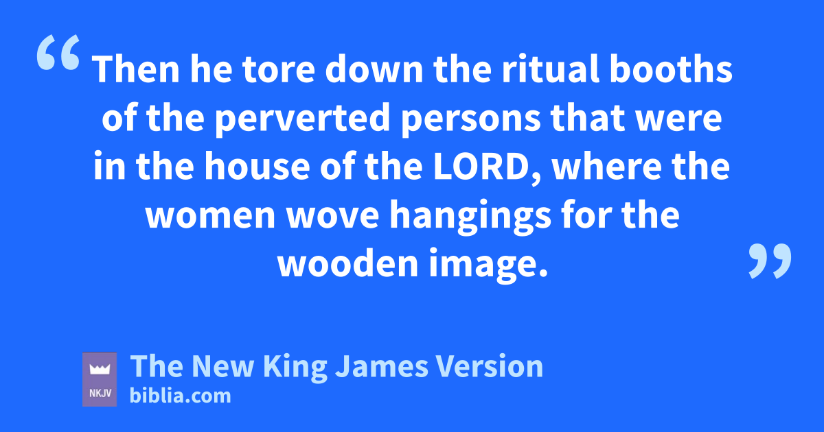 3 Then the king dstood by a pillar and made a ecovenant before the Lord, to follow the Lord and to keep His commandments and His testimonies and His statutes, with all his heart and all his soul, to perform the words of this covenant that were written in this book. And all the people took a stand for the covenant. 4 And the king commanded Hilkiah the high priest, the fpriests of the second order, and the doorkeepers, to bring gout of the temple of the Lord all the articles that were made for Baal, for 1Asherah, and for all 2the host of heaven; and he burned them outside Jerusalem in the fields of Kidron, and carried their ashes to Bethel. 5 Then he removed the idolatrous priests whom the kings of Judah had ordained to burn incense on the high places in the cities of Judah and in the places all around Jerusalem, and those who burned incense to Baal, to the sun, to the moon, to the 3constellations, and to hall the host of heaven. 6 And he brought out the iwooden 4image from the house of the Lord, to the Brook Kidron outside Jerusalem, burned it at the Brook Kidron and ground it to jashes, and threw its ashes on kthe graves of the common people. 7 Then he tore down the ritual 5booths lof the 6perverted persons that were in the house of the Lord, mwhere the nwomen wove hangings for the wooden image. 8 And he brought all the priests from the cities of Judah, and defiled the high places where the priests had burned incense, from oGeba to Beersheba; also he broke down the high places at the gates which were at the entrance of the Gate of Joshua the governor of the city, which were to the left of the city gate. 9 pNevertheless the priests of the high places did not come up to the altar of the Lord in Jerusalem, qbut they ate unleavened bread among their brethren.