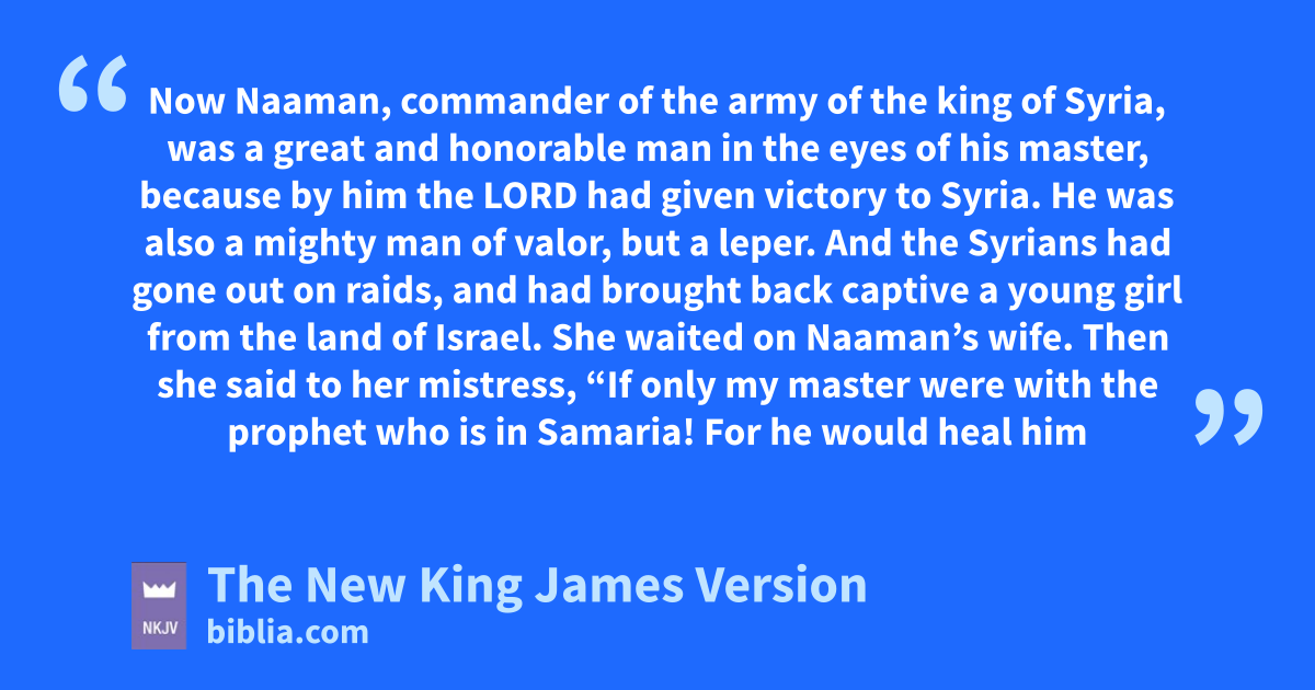 5 Now aNaaman, commander of the army of the king of Syria, was ba great and honorable man in the eyes of his master, because by him the Lord had given victory to Syria. He was also a mighty man of valor, but a leper. 2 And the Syrians had gone out con 1raids, and had brought back captive a young girl from the land of Israel. She 2waited on Naaman’s wife. 3 Then she said to her mistress, “If only my master were with the prophet who is in Samaria! For he would heal him of his leprosy.” 4 And Naaman went in and told his master, saying, “Thus and thus said the girl who is from the land of Israel.”