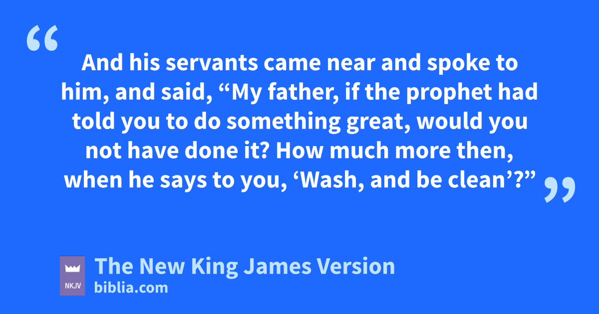 9 Then Naaman went with his horses and chariot, and he stood at the door of Elisha’s house. 10 And Elisha sent a messenger to him, saying, “Go and fwash in the Jordan seven times, and your flesh shall be restored to you, and you shall be clean.” 11 But Naaman became furious, and went away and said, “Indeed, I said to myself, ‘He will surely come out to me, and stand and call on the name of the Lord his God, and wave his hand over the place, and heal the leprosy.’ 12 Are not the 3Abanah and the Pharpar, the rivers of Damascus, better than all the waters of Israel? Could I not wash in them and be clean?” So he turned and went away in a rage. 13 And his gservants came near and spoke to him, and said, “My father, if the prophet had told you to do something great, would you not have done it? How much more then, when he says to you, ‘Wash, and be clean’?” 14 So he went down and dipped seven times in the Jordan, according to the saying of the man of God; and his hflesh was restored like the flesh of a little child, and ihe was clean.