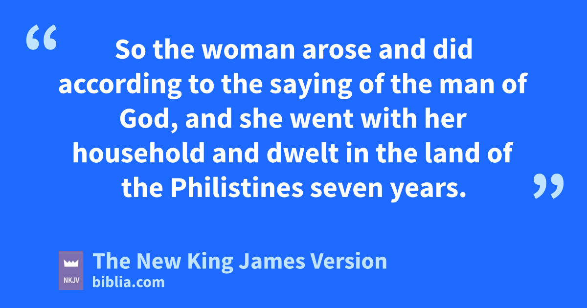 8 Then Elisha spoke to the woman awhose son he had restored to life, saying, “Arise and go, you and your household, and stay wherever you can; for the Lord bhas called for a cfamine, and furthermore, it will come upon the land for seven years.” 2 So the woman arose and did according to the saying of the man of God, and she went with her household and dwelt in the land of the Philistines seven years.