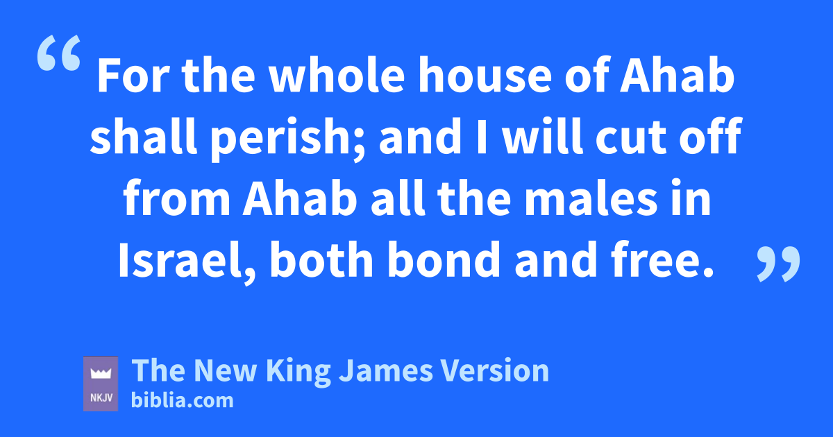 And he said, “For you, Commander.” 6 Then he arose and went into the house. And he poured the oil on his head, and said to him, f“Thus says the Lord God of Israel: ‘I have anointed you king over the people of the Lord, over Israel. 7 You shall strike down the house of Ahab your master, that I may gavenge the blood of My servants the prophets, and the blood of all the servants of the Lord, hat the hand of Jezebel. 8 For the whole house of Ahab shall perish; and iI will cut off from Ahab all jthe males in Israel, both kbond and free. 9 So I will make the house of Ahab like the house of lJeroboam the son of Nebat, and like the house of mBaasha the son of Ahijah. 10 nThe dogs shall eat Jezebel on the plot of ground at Jezreel, and there shall be none to bury her.’ ” And he opened the door and fled.