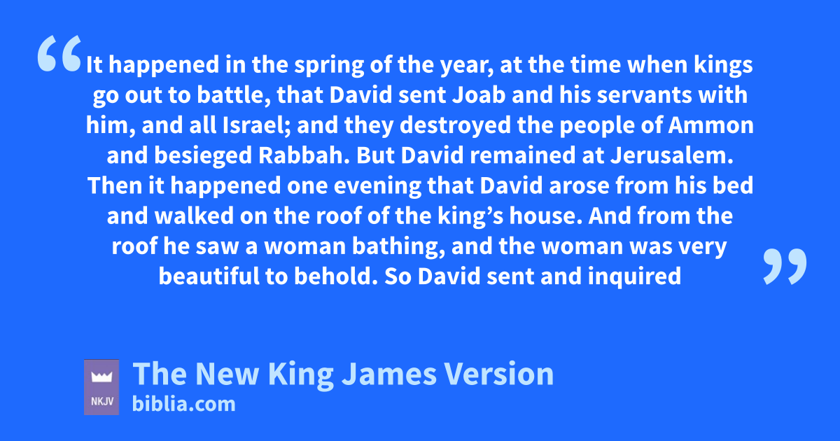 2 Then it happened one evening that David arose from his bed dand walked on the roof of the king’s house. And from the roof he esaw a woman bathing, and the woman was very beautiful to behold. 3 So David sent and inquired about the woman. And someone said, “Is this not 1Bathsheba, the daughter of 2Eliam, the wife fof Uriah the gHittite?” 4 Then David sent messengers, and took her; and she came to him, and hhe lay with her, for she was icleansed from her impurity; and she returned to her house. 5 And the woman conceived; so she sent and told David, and said, “I am with child.”