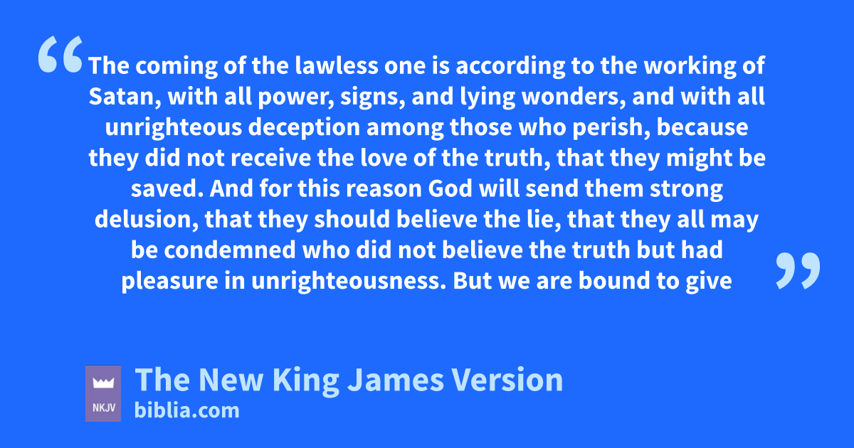 5 Do you not remember that when I was still with you I told you these things? 6 And now you know what is restraining, that he may be revealed in his own time. 7 For ithe 4mystery of lawlessness is already at work; only 5He who now restrains will do so until 5He is taken out of the way. 8 And then the lawless one will be revealed, jwhom the Lord will consume kwith the breath of His mouth and destroy lwith the brightness of His coming. 9 The coming of the lawless one is maccording to the working of Satan, with all power, nsigns, and lying wonders, 10 and with all unrighteous deception among othose who perish, because they did not receive pthe love of the truth, that they might be saved. 11 And qfor this reason God will send them strong delusion, rthat they should believe the lie, 12 that they all may be condemned who did not believe the truth but shad pleasure in unrighteousness.